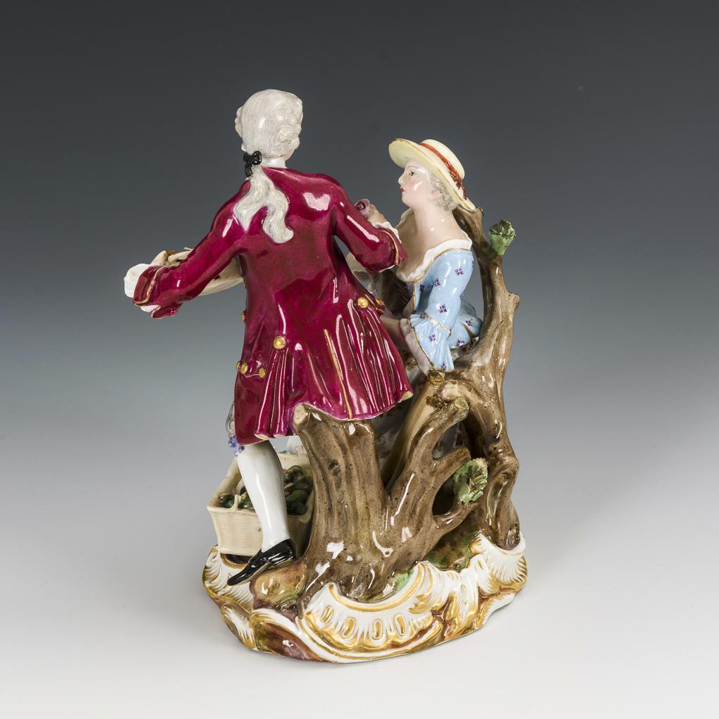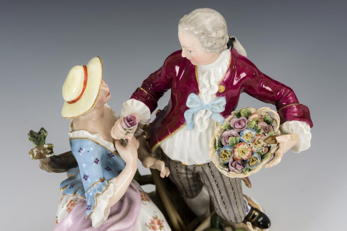 Gärtnerpaar mit Blütenkorb sowie Gemüsekorb zu ihren Füßen. Baum defekt, beide Gartengeräte bestoßen, Bestoßungen an Blüten, Blättern und 1 Daumen.