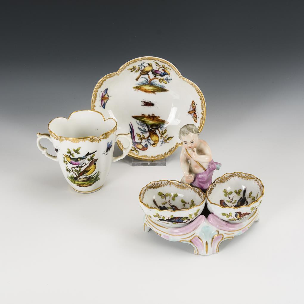 Sich den Finger leckender Putto zwischen zwei Gewürzschalen mit Vogelmalerei (H 12,5 cm). / Doppelhenkeltasse mit Vogelmalerei (H 8 cm) und originaler Untertasse (Ø 13,5 cm).