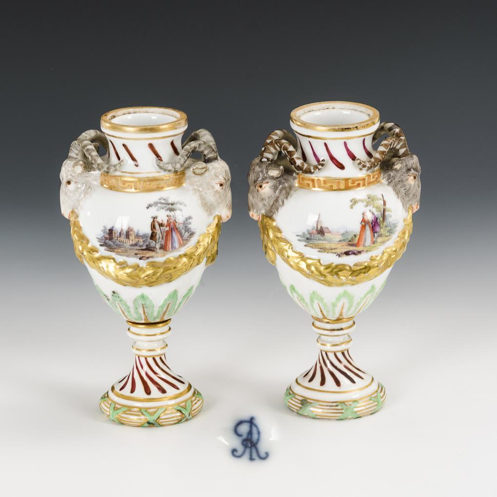 Ovoide Vasen mit zwei Widderkopfhandhaben und Lorbeerfestons. Beidseitig eine gemalte Landschaft mit galanten Paaren. Ohne Deckel, 1 Horn und Widderohr restauriert, kleine Bestoßung an 1 Korpusansatz, minimaler Goldabrieb.