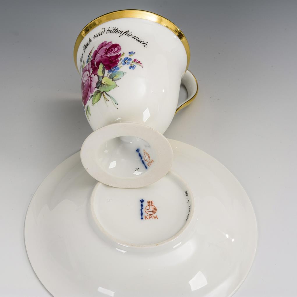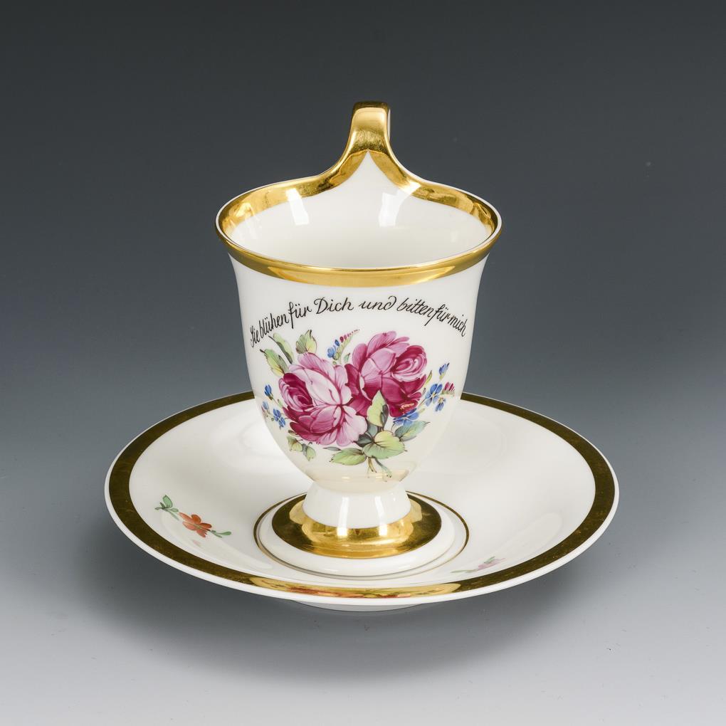 Polychrom bemalt, goldstaffiert. H Tasse 11,5 cm, Ø originale Untertasse 14 cm.