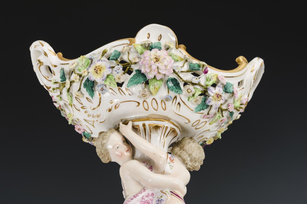 Blütenbelegte Durchbruchschale auf einem von zwei Putten umschlungenen Baumstammschaft, Felssockel mit Blütenbelag. Partiell Bestoßungen am Belag, minimaler Goldabrieb.