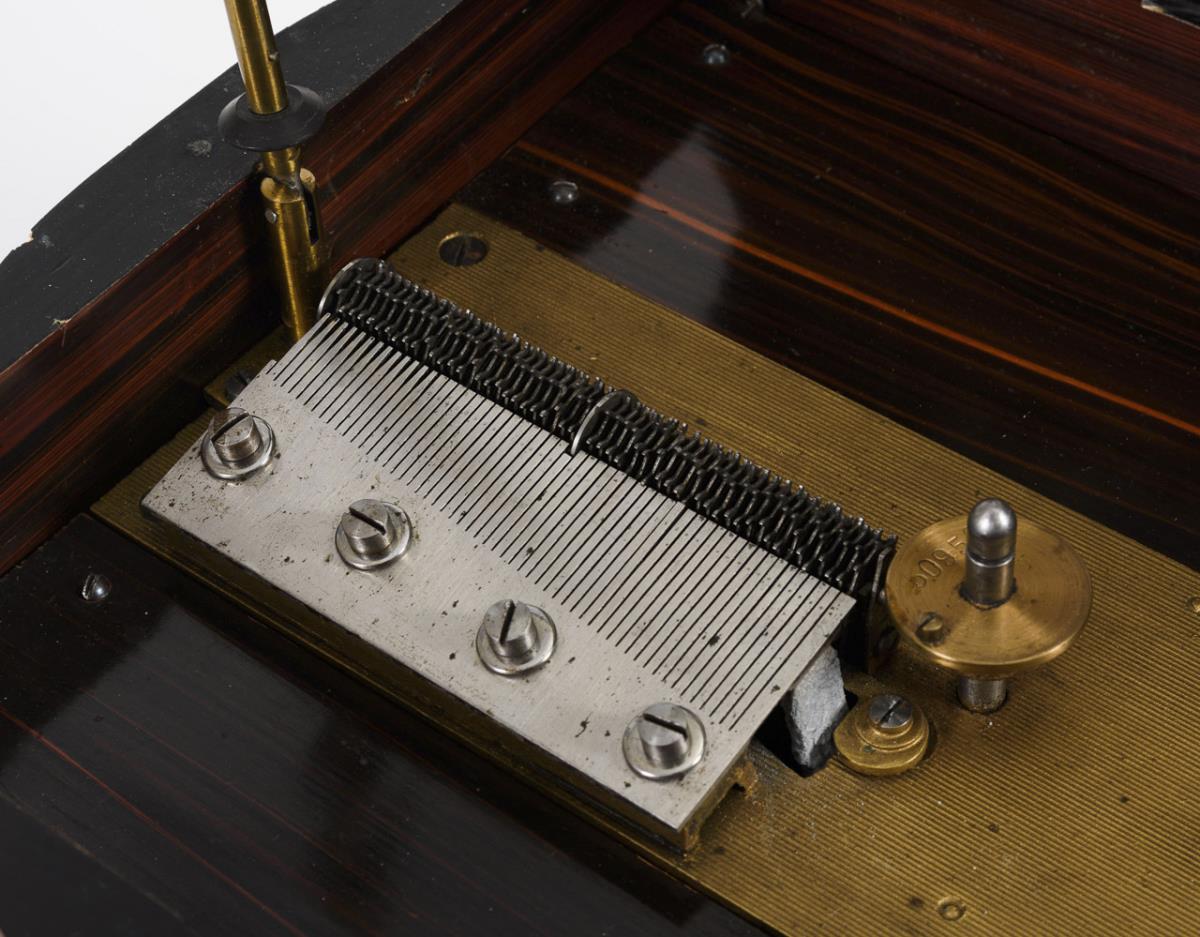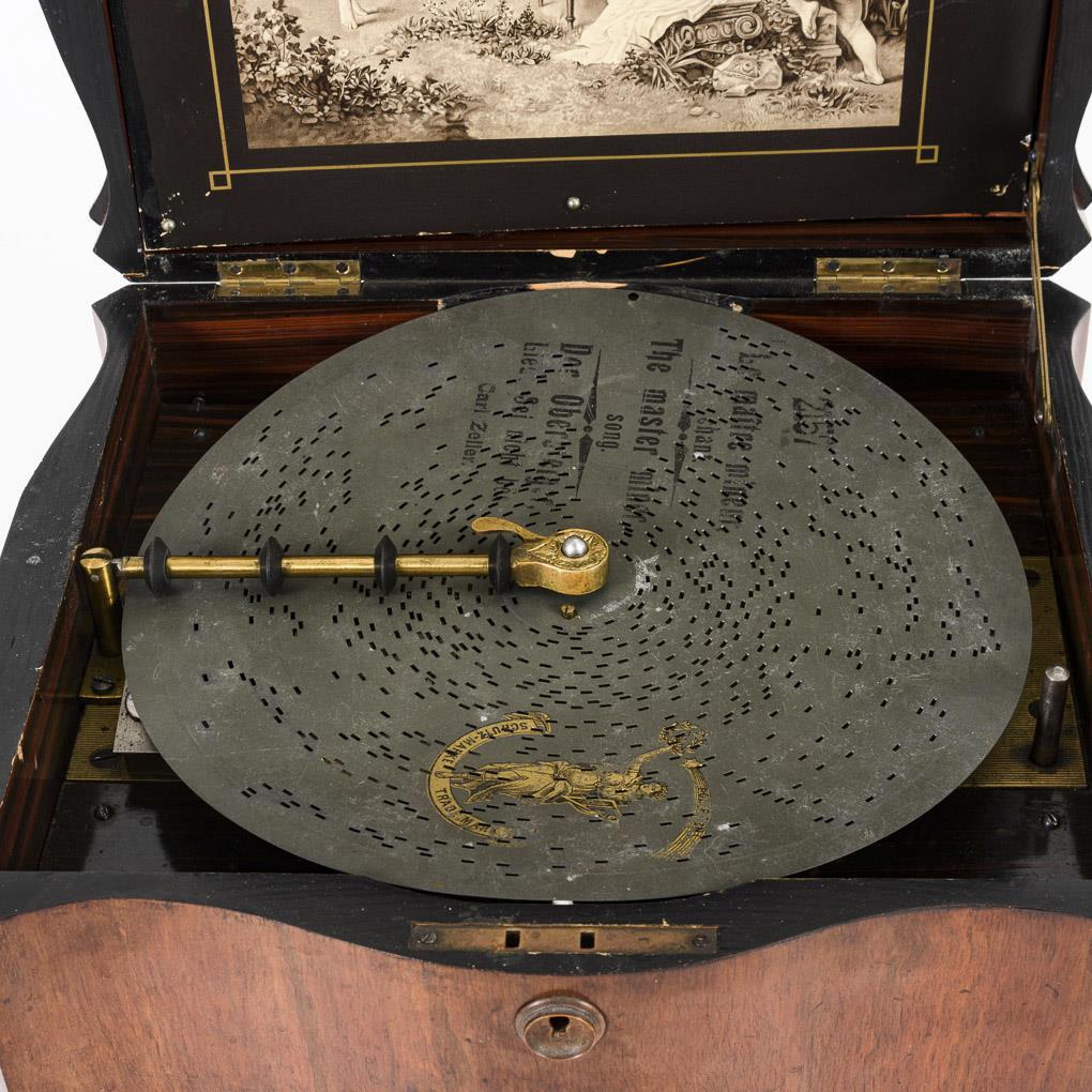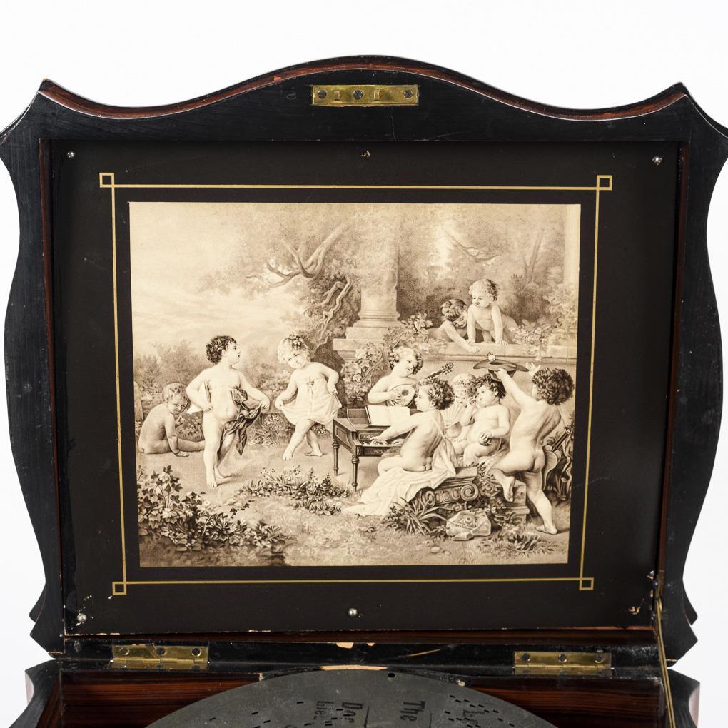 Geschweifter Korpus mit Stellhebel in der Front. Im Deckel Lithografie mit musizierenden und tanzenden Putten. "Spieluhr" mit Werk unter geriffelter und goldbronzierter Gusseisenplatte, Sternenrad mit Zungenkamm 12 cm, auf der Antriebswelle "50956". Lochplatten Ø 28 cm je "Polyphon" gemarkt (z.B. Stille Nacht, Die schöne Polin, Edelweiß usw.). Minimale Furnierschäden und Fehlstellen an der Bodenplatte, korrodierte Resonatoren (dadurch etwas verstimmt).
