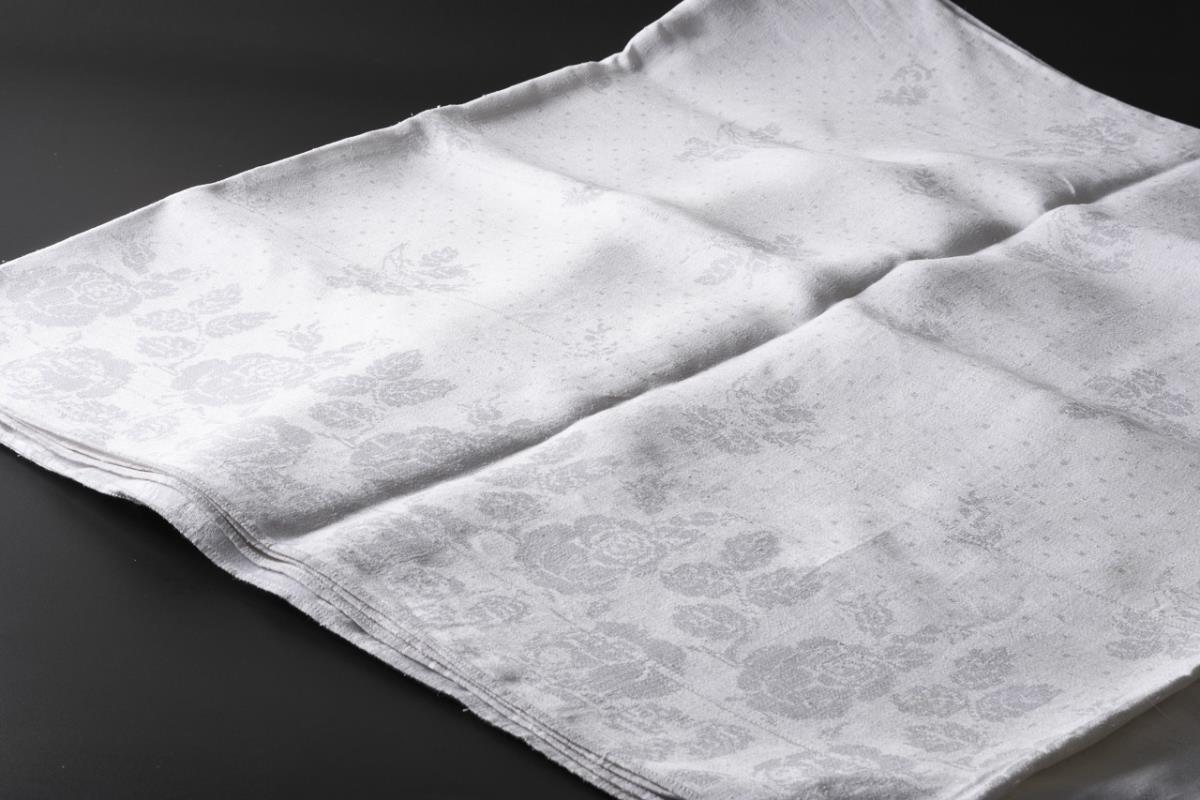 Gewebtes Rosenmuster. Rot gesticktes Monogramm "HW". Einige wenige Alters-/Gebrauchsspuren.