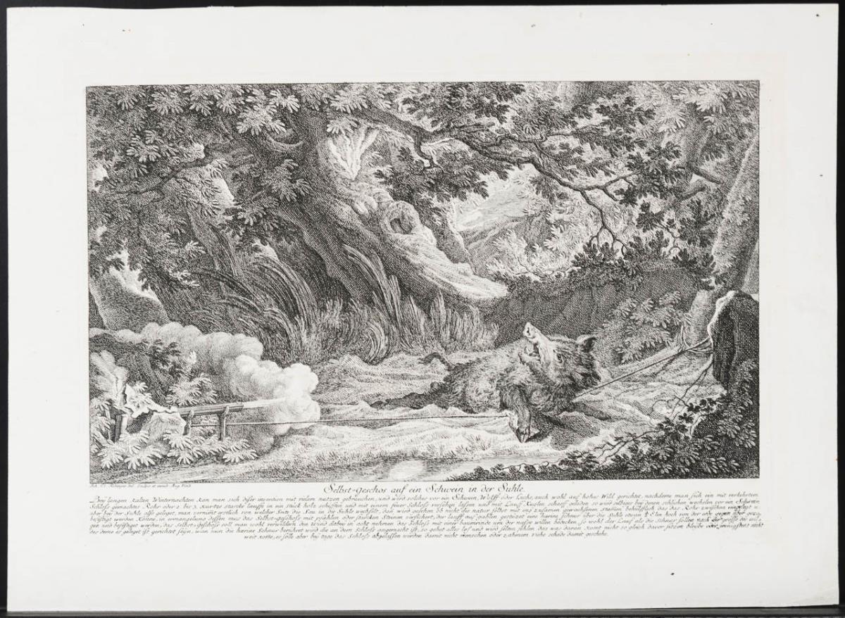 "Der Anstand auf einen Hirschen. Im Walde bey Schleisheim nach der Natur gezeichnet. Anno 1735", Platte: 33,5 x 24,5 cm, Blatt: 40,5 x 31,5 cm, nummeriert: 282 | "Selbst-Geschos auf ein Schwein in der Suhle", Platte: 24,5 x 36,5 cm, Blatt: 32 x 43,5 cm. Je mit leichtem Lichtschaden.