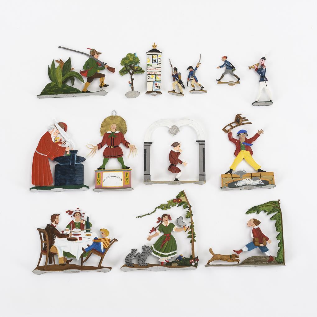 "Der Struwwelpeter" neu gezeichnet von Otto Schmitz, Verlag Ernst Uhl, Schwabach-Nürnberg (1943). Broschur. / "Der Struwwelpeter" von Dr. Heinrich Hoffmann, Verlag Braun & Schneider, München 1954, neu umgezeichnet von Wolfgang Felten. / "... und noch einmal Struwwelpeter - Moralische Geschichten" Horst Lemke und Waltraud Nicolas. Ähren-Verlag, Heidelberg 1947, Broschur, Deckblatt lose. / "Der Struwwelpeter zur Wahl oder böse Struwweleien über drollige Politiker", Lämmchen Kralle, Ralf Alex Fichtner. Autorenhaus-Verlag Plinke, Berlin 1998, Broschur. / 8 Seiten Ausmalheft, benutzt. /// 8 bemalte Zinnfiguren zum Struwwelpeter-Thema mit den bekannten Motiven, sowie 6 nicht dazugehörige. Mit dem Alter zunehmende Gebrauchsspuren.