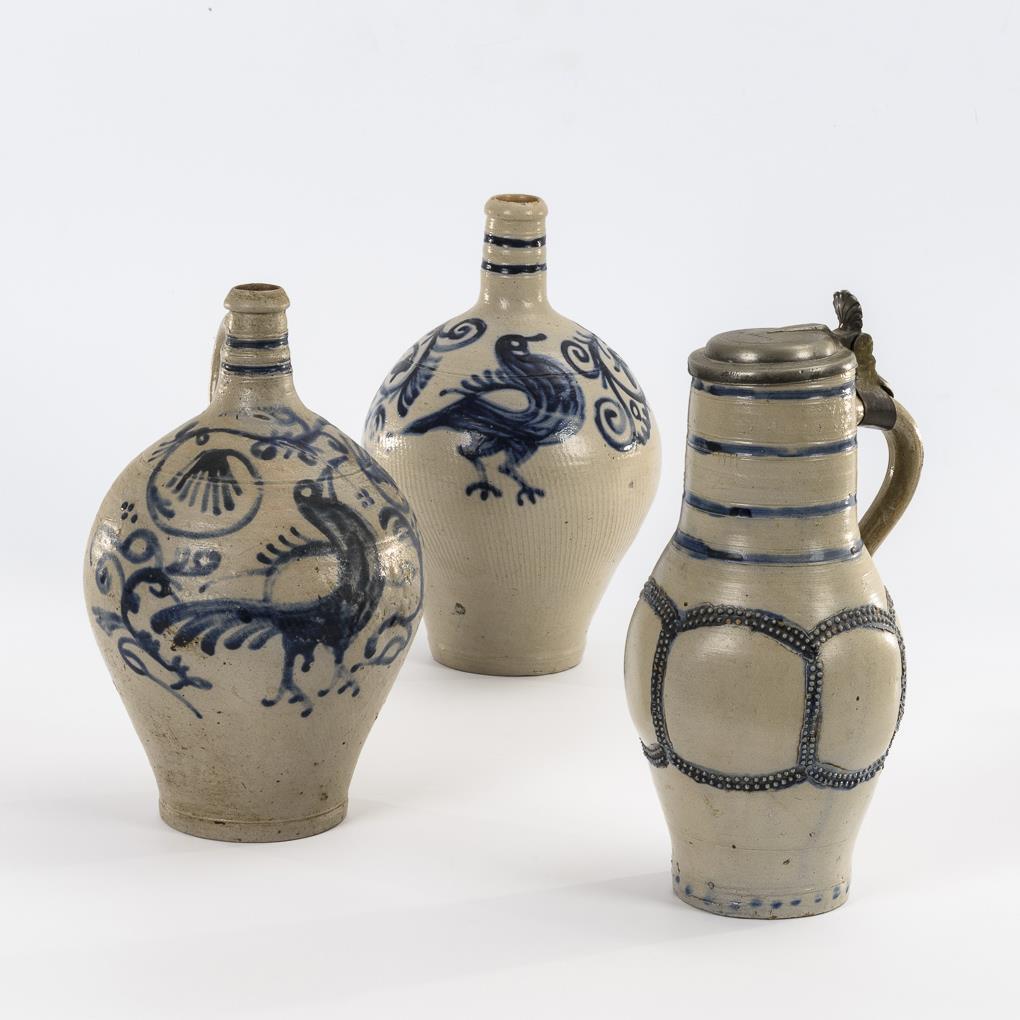 3 Steinzeug-Krüge mit Blaumalerei. Westerwald.
