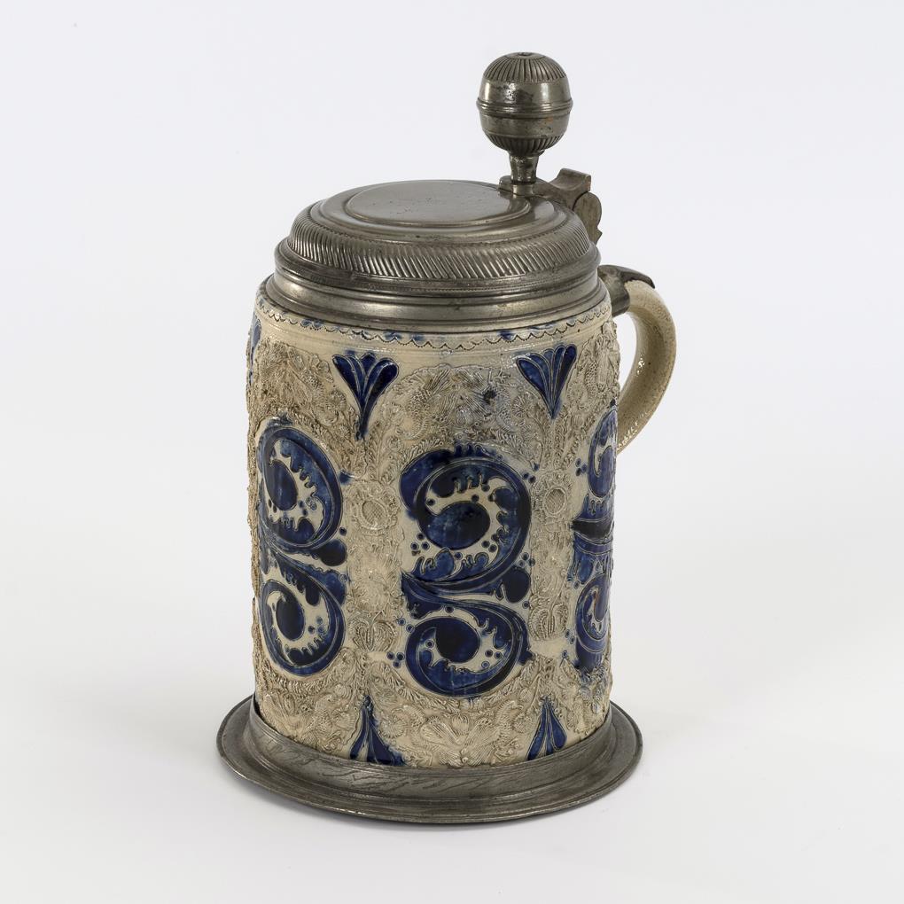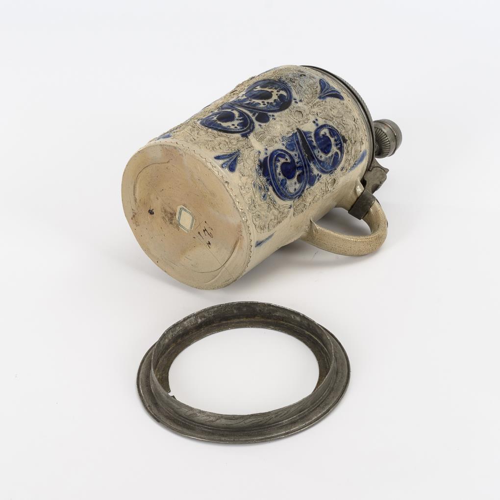 Modelkartuschen mit Blumen und Vögeln sowie gerolltem Blattwerk, Bandhenkel. Profilierter Zinndeckel mit großem Kugeldrücker, innen gepunzt, loser Zinnstandring. Feiner Boden- und Wandungsriss, umlaufender Haarriss im Mündungsbereich, Zinn teils mit Defekten.