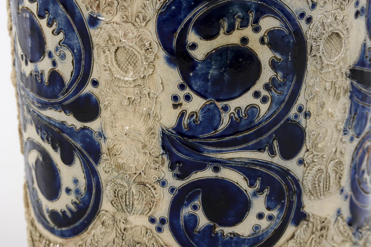 Graues, salzglasiertes Steinzeug mit Ritz-, Model- und Stempeldekor und kobaltblauer Bemalung. H 26 cm.