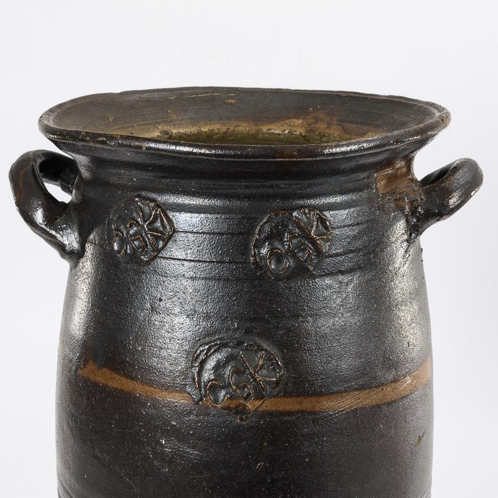 Zylindrisches Bodengefäß mit 2 Henkeln und Wellenfuß, Wandung mit Rillenzier und runden Auflagen mit Monogramm "CGK". Restauriert, teils bestoßen, innen kurzer, feiner Haarriss.