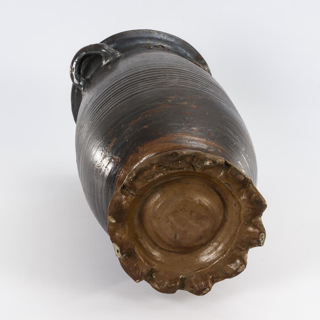 Graues, salzglasiertes Steinzeug, dunkelbraun lehmengobiert. H 57 cm.