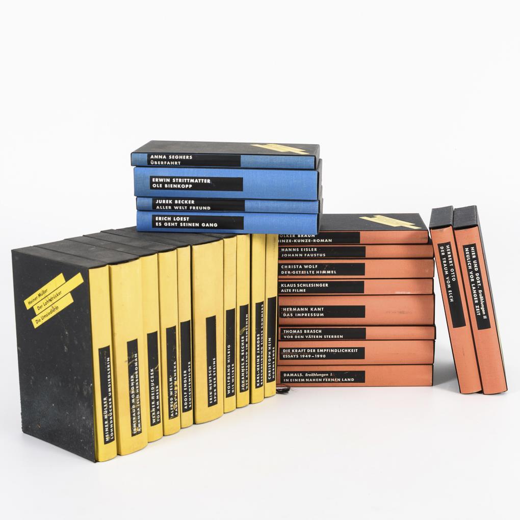 Vorzugsausgabe mit einer Auflage von 300 Exemplaren. Leineneinbände im Schuber. Irmtraud Morgner: "Amanda", Grafik: Harald Metzkes / Erik Neutsch: "Spur der Steine", Grafik: Willi Sitte / Christa Wolf: "Der geteilte Himmel", Grafik: Nuria Quevedo / Thomas Brasch: "Vor den Vätern sterben die Söhne", Grafik: Volker Stelzmann / Christopher Hein: "Horns Ende", Grafik: Rolf Münzner / Volker Braun: "Hinze-Kunze-Roman", Grafik: Baldwin Zettl / Adolf Endler: "Schichtenflotz", Grafik: R.A. Penck / Heiner Müller: "Der Lohndrücker", "Die Umsiedlerin", Grafik: Xago Schröder / J.R. Becher: "Der Aufstand im Menschen", Grafik: Karl-Georg Hirsch / Hanns Eisler: "Johannes Faustus", Grafik: Bernd Heisig / Erich Loest: "Es geht seinen Gang ...", Grafik: Ulrich Hachulla / Hermann Kant: "Das Impressum", Grafik: Joachim John / "Die Kraft der Empfindlichkeit" Essays 1949 - 1990, Grafik: Hermann Naumann / Wolfgang Hilbig: "Die Weiber", Grafik: Hans Ticha / Klaus Schlesinger: "Alte Filme", Grafik: Hartwig Ebersbach / Erzählungen 1949 - 1969, Grafik Dieter Tucholke / Erzählungen 1970 - 1990, Grafik Wolfgang Henne / Erwin Strittmatter, "Ole Bienkopp", Grafik: Gudrun Brüne / Herbert Otto: "Der Traum vom Elch", Grafik: Klaus Süß / Werner Heiduczek: "Tod am Meer", Grafik: Wolfgang Mattheuer / K.-H. Jakobs: "Beschreibung eines Sommers", Grafik: Frank Ruddigkeit / Alfred Welm: "Pause für Wanzka", Grafik: Christ Jahr / Jurek Becker: "Aller Welt Freund", Grafik: Sighard Gille / Anna Seghers: "Überfahrt", Grafik: Heidrun Hegewald. Rückentitel und Schuber berieben, einige Einbände schwach verschmutzt.