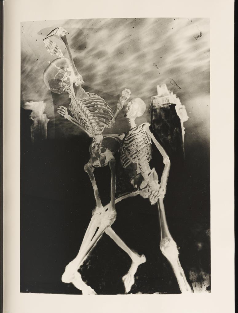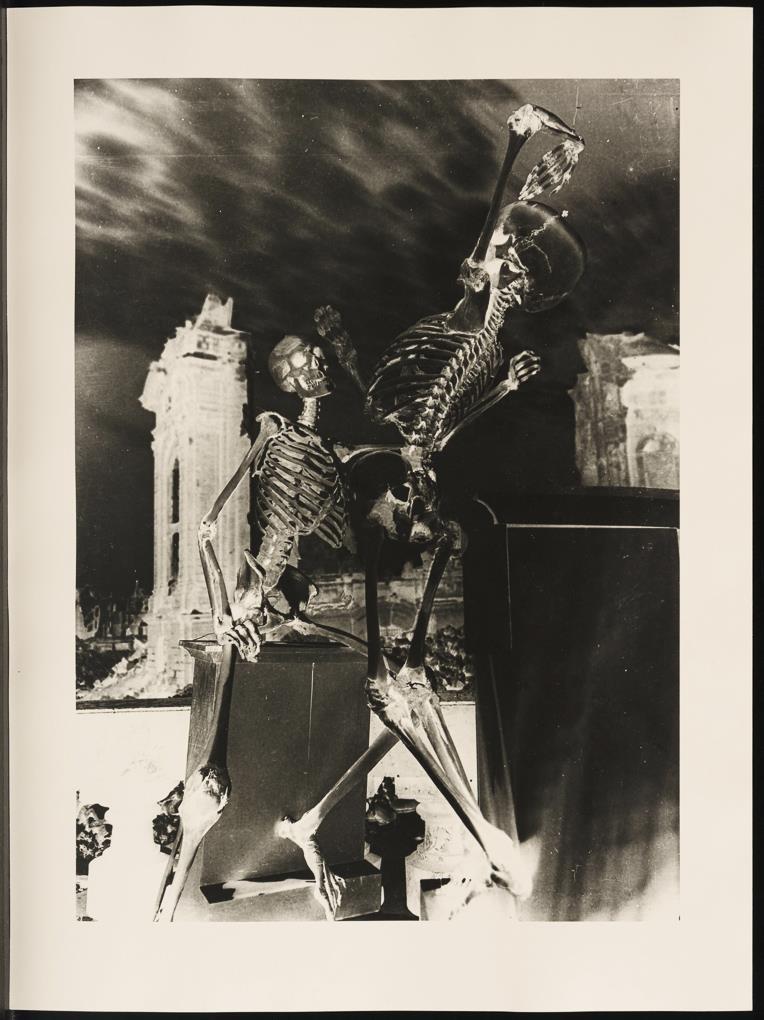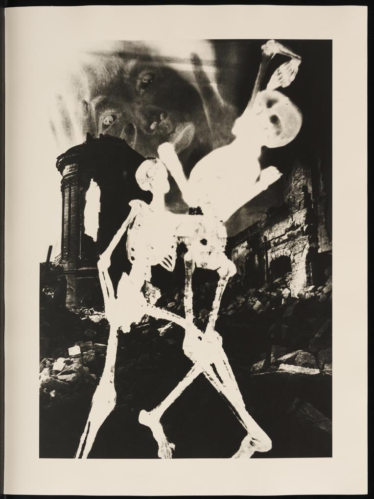Vollständige Mappe mit Titelblatt, 2 Textblättern und 5 fotografischen Werken - Skelette und Bilder des zerstörten Dresden als Negativ-Positiv-Montagen: "Tod über Dresden", "Sirenen Alarm", "Feuersturm", "Tote und Trümmer" und "Toten-Reigen".