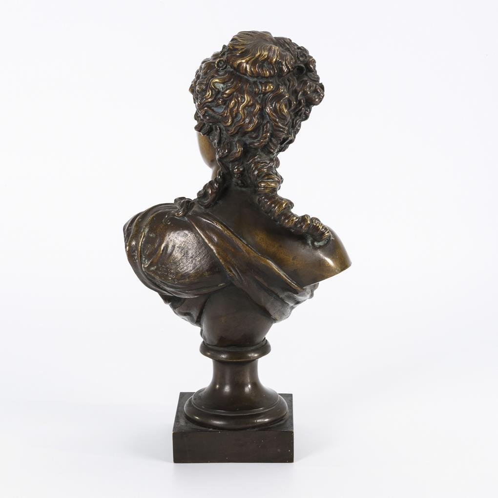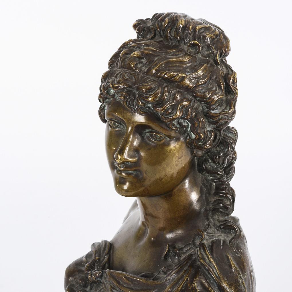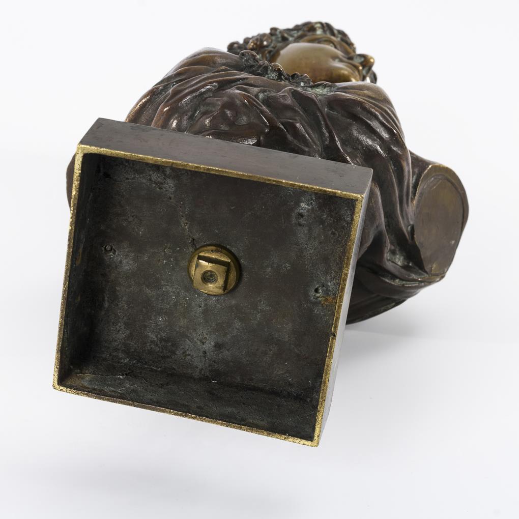Bronze zweifarbig patiniert, Bronze-Sockel. Wohl Frankreich. Reste einer Bezeichnung am Armschnitt(?). H 38 cm.