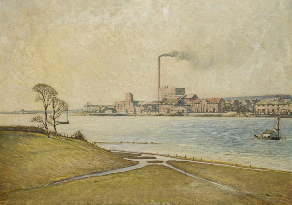 Große Industrieanlage an einem Fluss unter bedecktem Himmel. Eine restaurierte Stelle mit Hinterklebung.