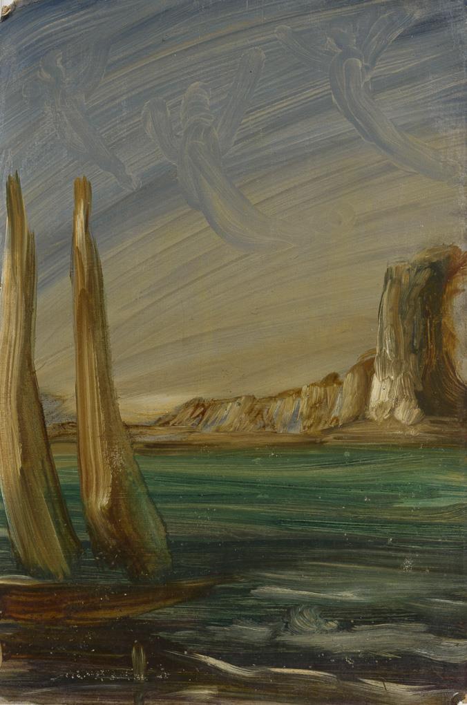 Segler vor Steilküste mit geisterhaften Wesen im Himmel. Leichte Alterspuren.