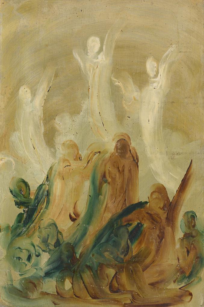 Schemenhaft erkennbares Getümmel aus Personen mit drei hellen Wesen darüber. Leichte Altersspuren.