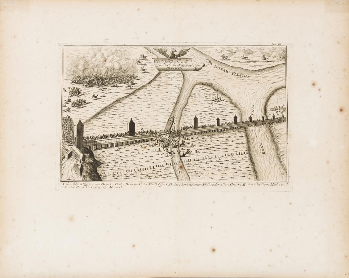 2 Darstellungen aus "Historische Schauplätze merkwürdiger Brücken [...]", Leipzig 1735, bezeichnet: "Prospect der langen Schiff u. Höltzernen Brücken [...]", mit Legende und Begleittext in deutscher Sprache | "Die so berühmte und Wunderbahre Essecker Brücken", mit Legende. Je mit Stockflecken und Bugfalte.