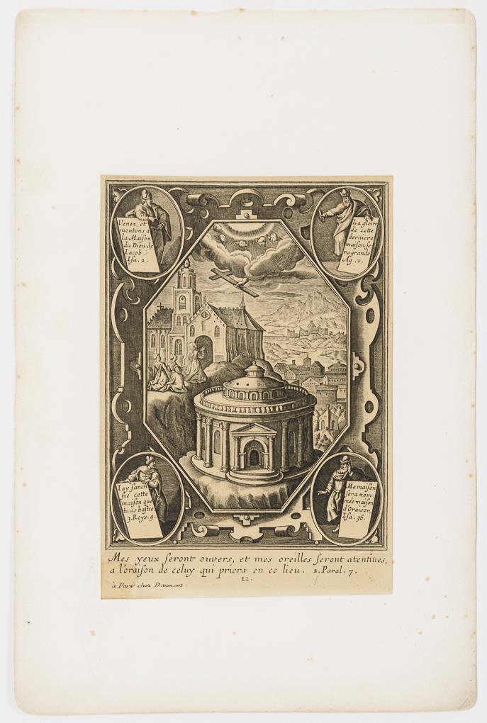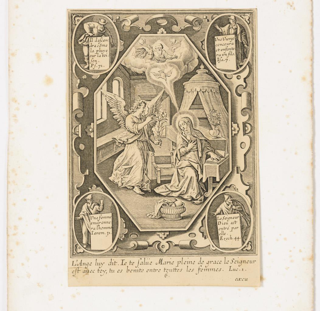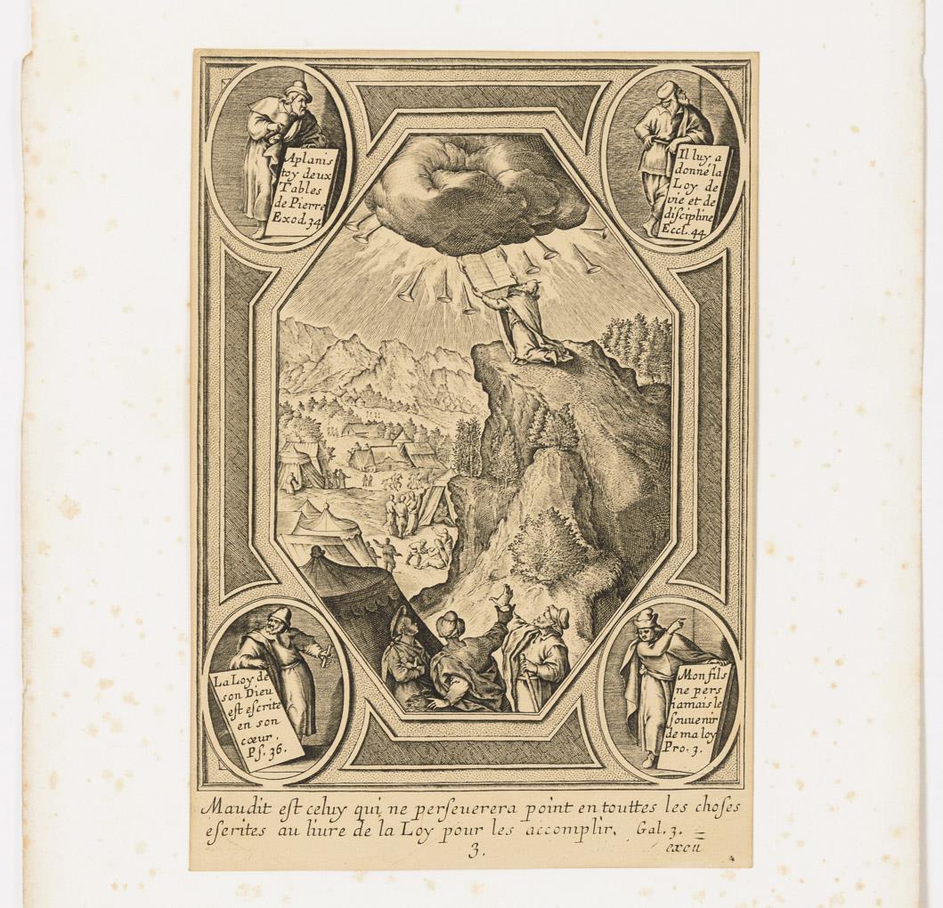 Anonyme Kopien nach Thomas de Leu: Titelblatt und 10 biblische Darstellungen vom Sündenfall bis Auferstehung; in Ornamentrahmen mit sinnbildlichen Medaillons in den Ecken, bezeichnet in französischer Sprache, in der Platte ausgeschliffene Verlegeradresse von "Mariette", nummeriert: 2 - 7, 9 - 12 (8 fehlt). Je auf stockfleckiges Papier montiert.