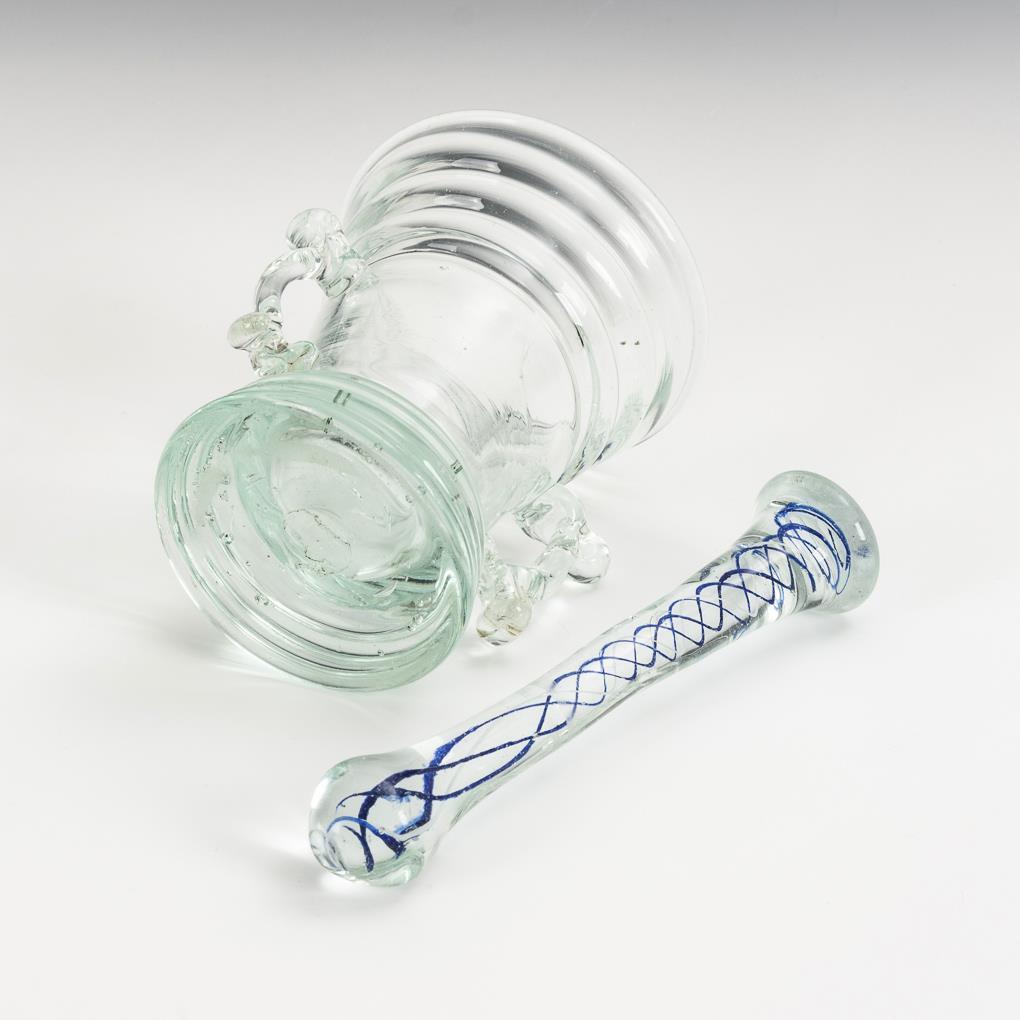 Farbloses Glas, Pistill mit eingeschmolzener Fadenspirale in Weiß und Blau. H Mörser 11,5 cm, L Pistill 16 cm.