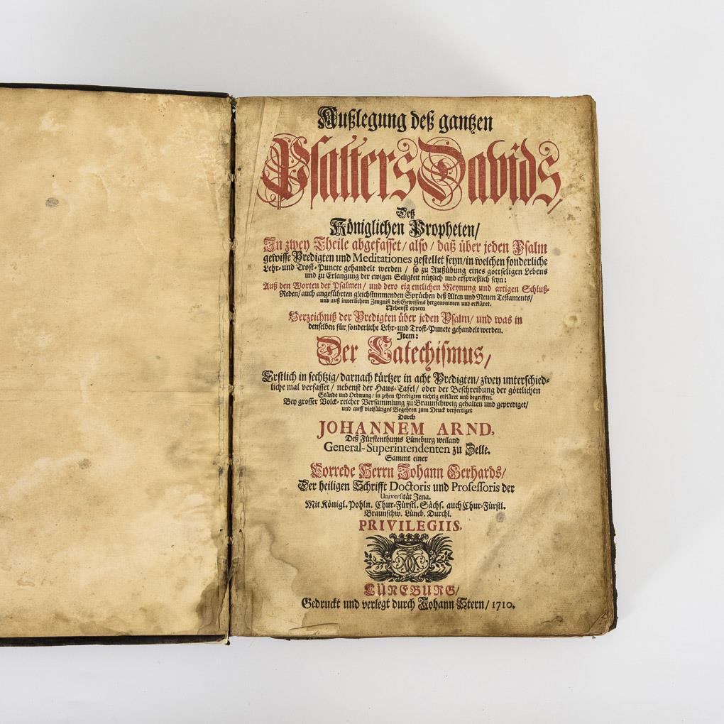 "... Deß Königlichen Propheten: In zwey Theile abgefasset, also, daß über jeden Psalm gewisse Predigten und Meditationes gestellet seyn, in welchen sonderliche Lehr- und Trost-Puncte gehandelt werden ... ; Item: Der Catechismus, Erstlich in sechtzig, darnach kürtzer in acht Predigten, zwey unterschiedliche mal verfasset, nebenst der Haus-Tafel, oder der Beschreibung der göttlichen Stände und Ordnung, in zehen Predigten richtig erklähret und begriffen ...".