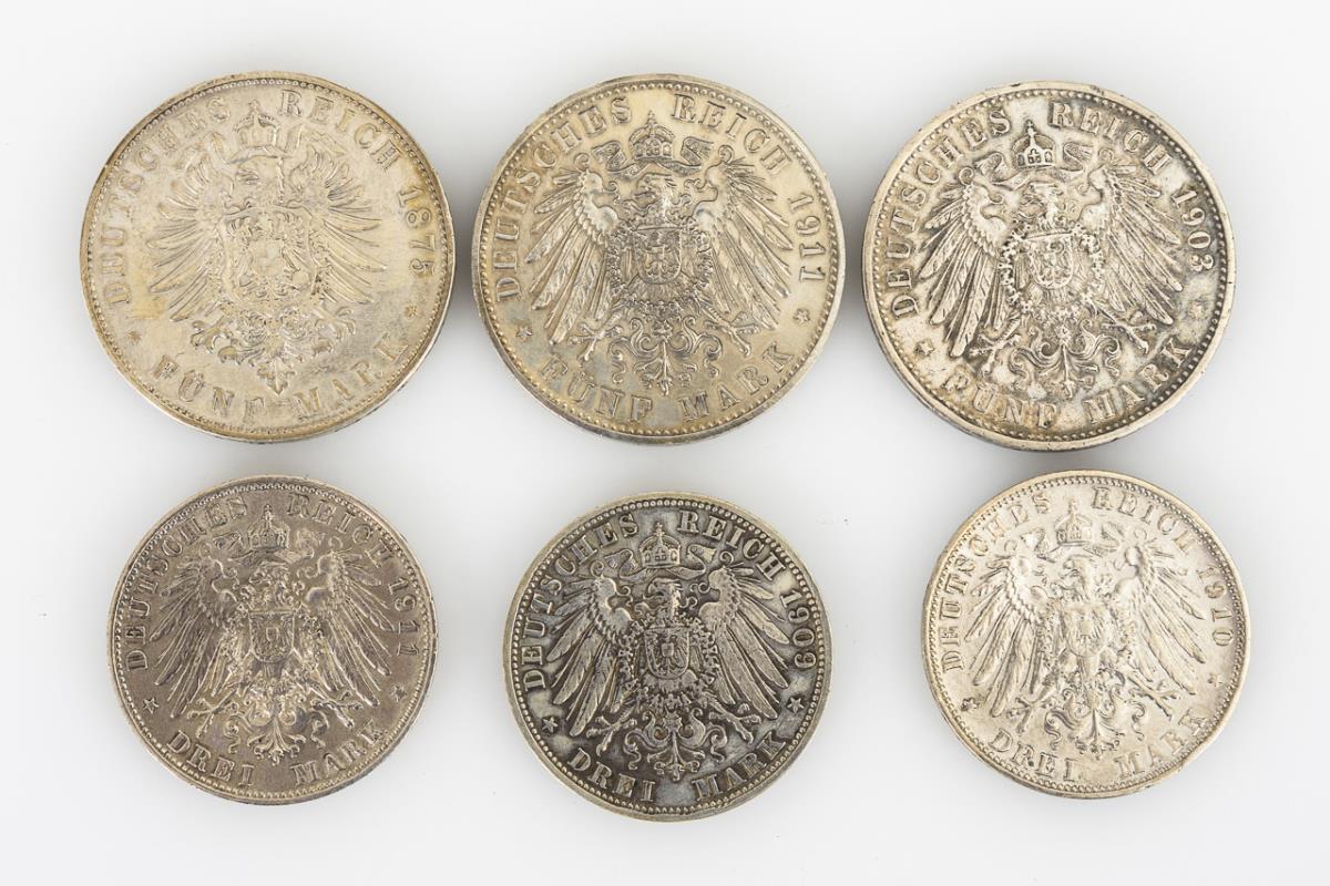 5 Mark 1875, "Ludwig II Koenig v. Bayern" / 5 Mark 1903, "Otto Koenig von Bayern" / 5 Mark 1911, Luitpold Prinz-Regent v. Bayern" / 3x 3 Mark "Otto Koenig von Bayern" 1909, 1910,1911. Zustand: sehr schön.