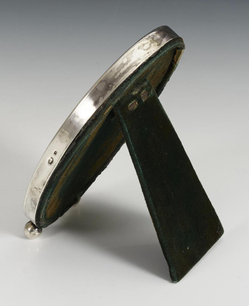 Tischrahmen mit kleinem, runden Bildausschnitt in Lorbeerkranz. Großer Chip im Email.