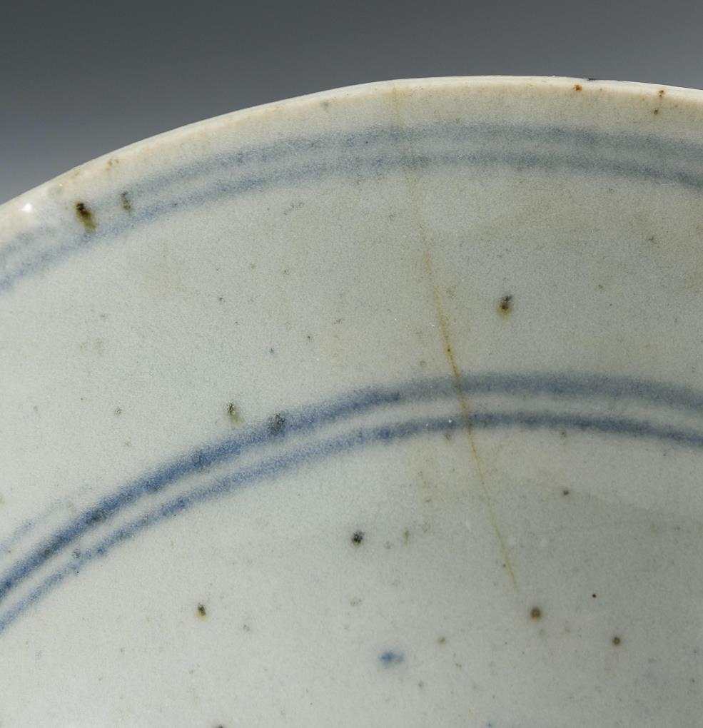 Vier ähnlich gemusterte Schalen mit dezentem Innendekor und kräftigem Außendekor. Die größere Schale ebenso. Diese mit Haarriss. Eine kleine Schale mit Chip am Innenfuß.