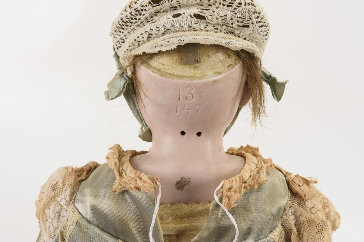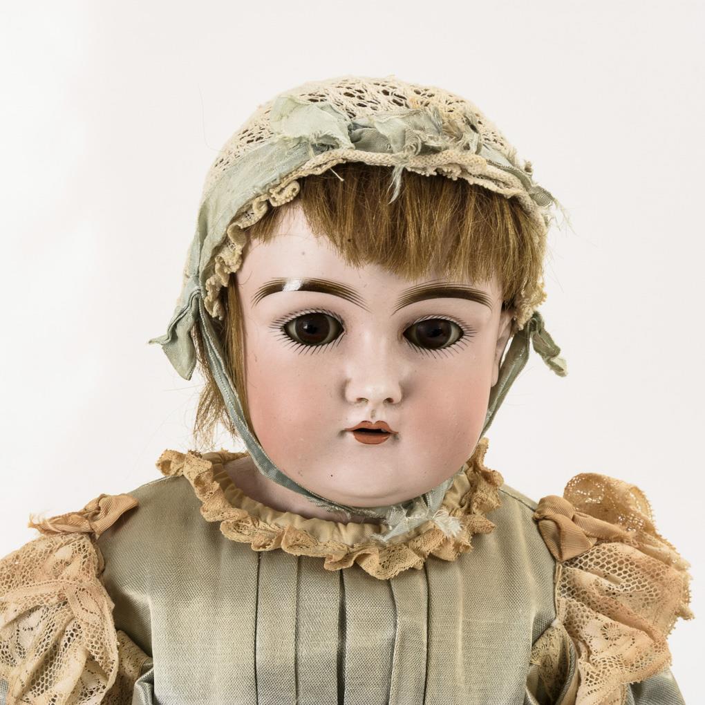 Braune Schlafaugen, defekte blonde Echthaarperücke. Lederkörper mit Biskuitunterarmen, Stoffunterschenkeln und Zwickeln an Ellbogen, Po und Knien. Aufwendig in alter Art nachgenähtes hellgraues Kleid mit Spitzen, Haube. Kopf mit originalem Gipsdeckel, Chip am rechten Ohr, Zähnchen fehlen. Körper fleckig, mit kleinen Defekten.