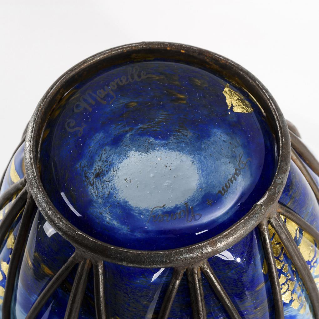 Farbloses Glas mit hellblauen, dunkelblauen und braunen Pulvereinschmelzungen sowie eingeschmolzener, gesprengter Goldfolie in der Zwischenschicht, Eisenmontierung. H 17 cm.