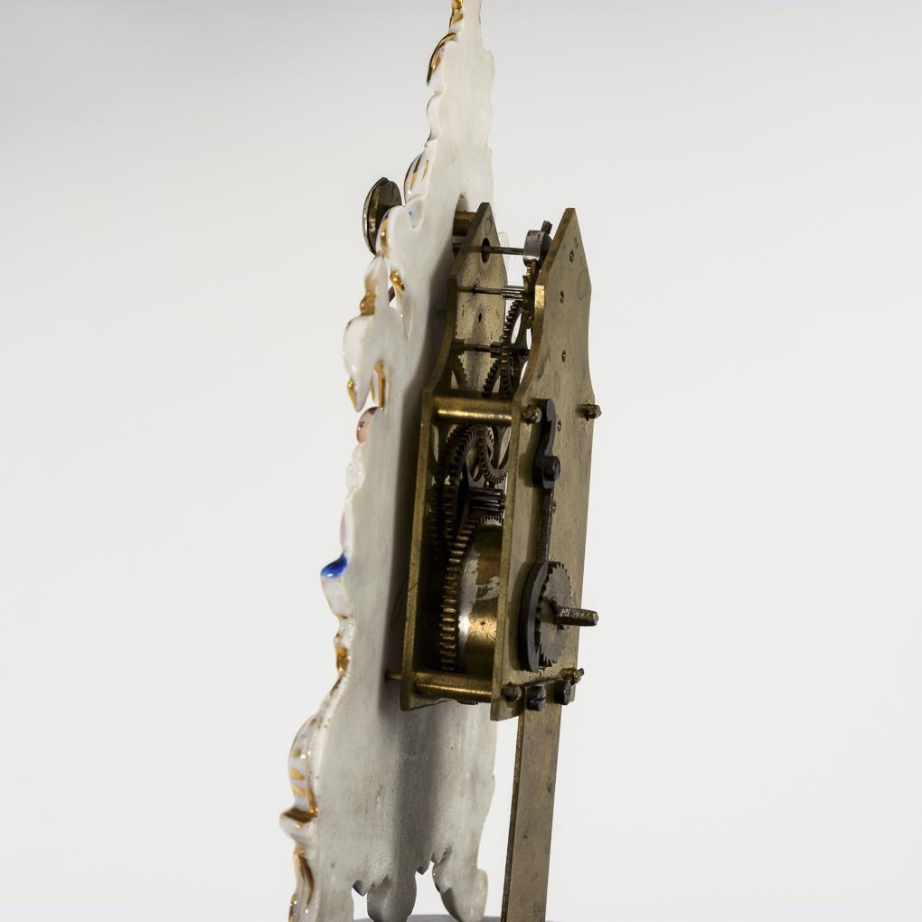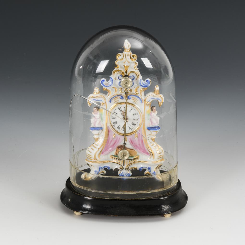 Porzellanplakette in Form einer Uhr mit Putten- und Löwenrelief sowie Zifferblatt mit römische Zahlen; Uhr mit Federwerk, Vorderzappler und Schlüsselaufzug (läuft an). Minimaler Goldabrieb, Glassturz defekt.