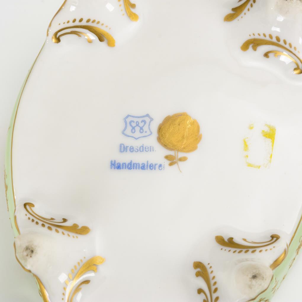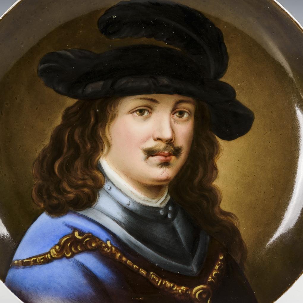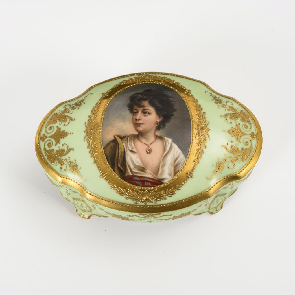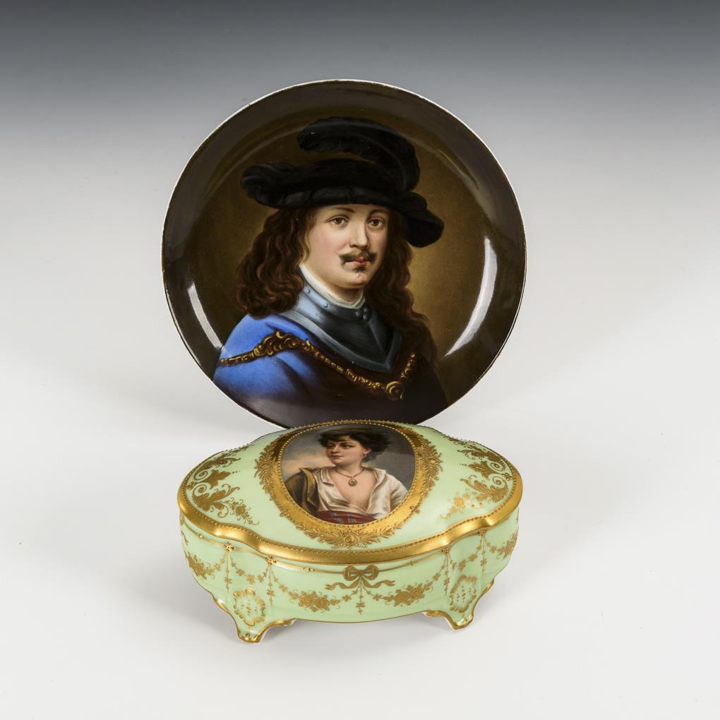 Dose gemarkt Wehsener Dresden: Ovale Vierpassdose mit hellgrünem Fond, ornamentaler Reliefgoldmalerei sowie einem Ovalmedaillon mit der Darstellung eines südländischen Mädchens nach B. E. Murillo (L 13,5 cm). / Teller mit dem Porträt eines Herren im Harnisch und mit Federhut (Ø 16 cm).