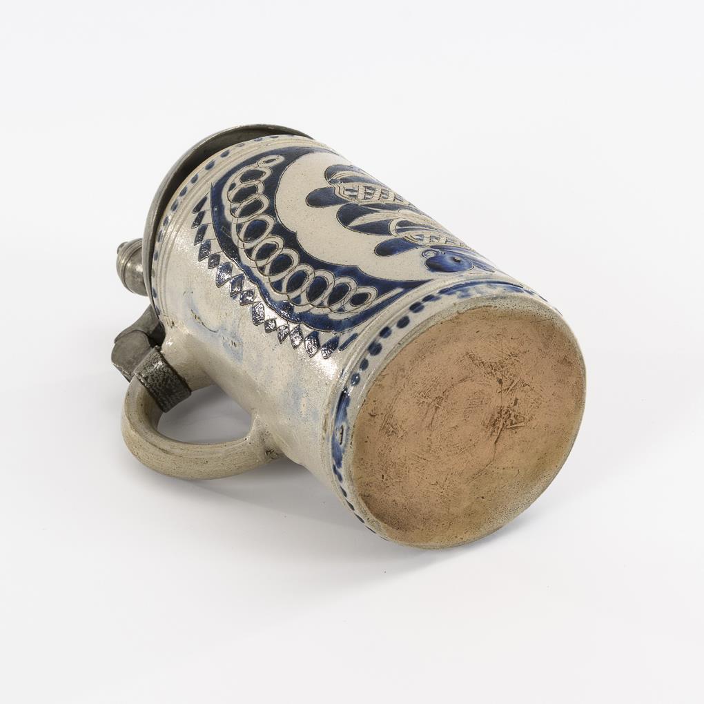 Zylinderkrug mit Ohrenhenkel. Schauseitig Blattornamente mit geflochtenen Dekorstreifen, flankiert von Spiralbändern. "J.N.A." gravierter Zinndeckel mit Kugeldrücker. Feiner Bodenriss, kleiner Wandungsabschlag, Deckel mit Defekten.