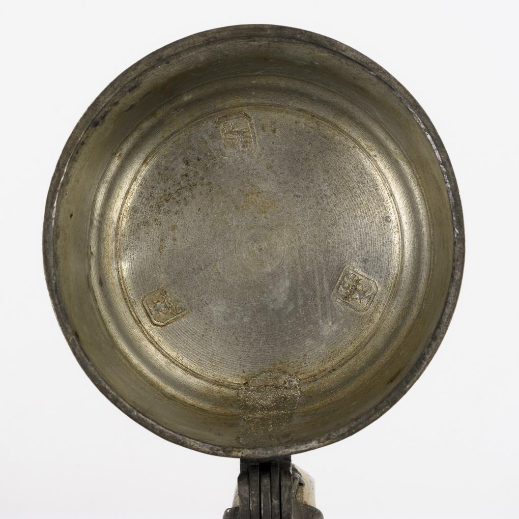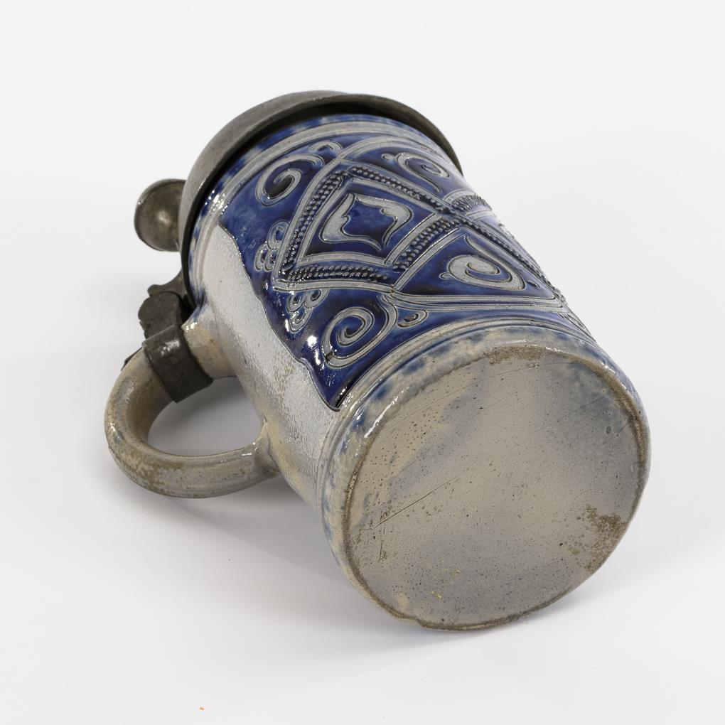 Zylinderkrug mit Ohrenhenkel. Schauseitig eine Ornamentkartusche mit Rauten und Perlbändern. "M.C.H." gravierter, hoher Zinndeckel mit Kugeldrücker, innen gepunzt. Deckel etwas gelockert, leicht berieben.