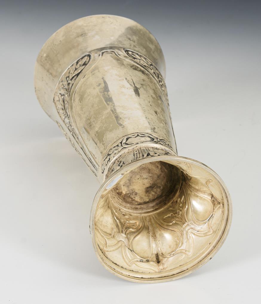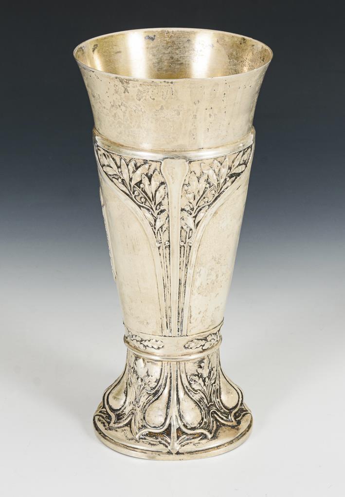 Konische Form mit reliefiertem Lorbeer-Dekor und aufgelegter Plakette "XXIV. Mitteldeutsches Bundes-Schiessen 21-28 Juni 1908 Gera". Altersspuren, Fuß und Wandung gedellt.
