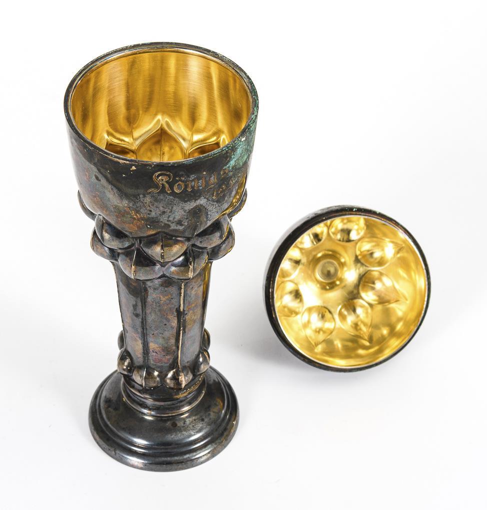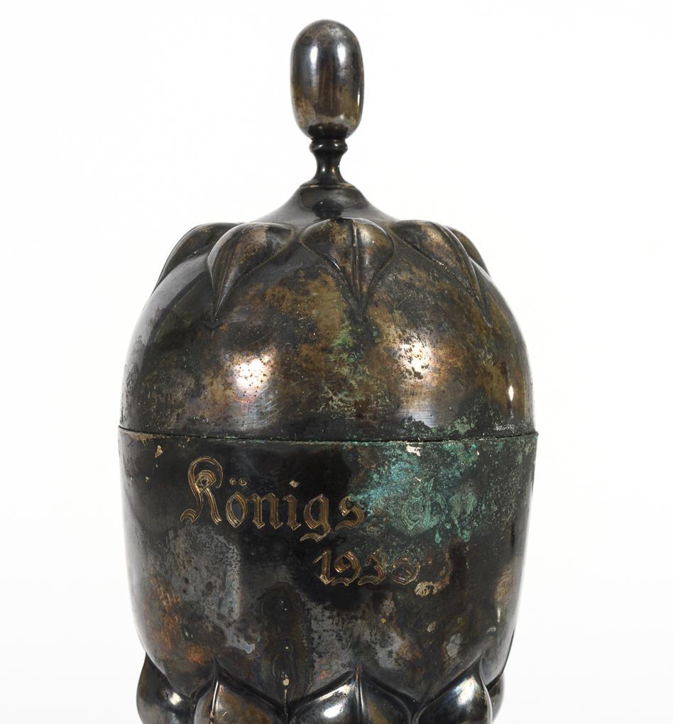 Schlanker Art-déco-Buckelpokal mit Wandungsgravur "Königsschuss 1938". Altersspuren, etwas Grünspan.