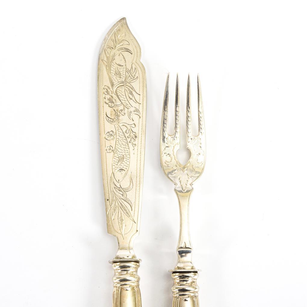2 Gabeln und 2 Messer mit Fischgravur und bekröntem Monogramm "IH XIV". Minimale Altersspuren.