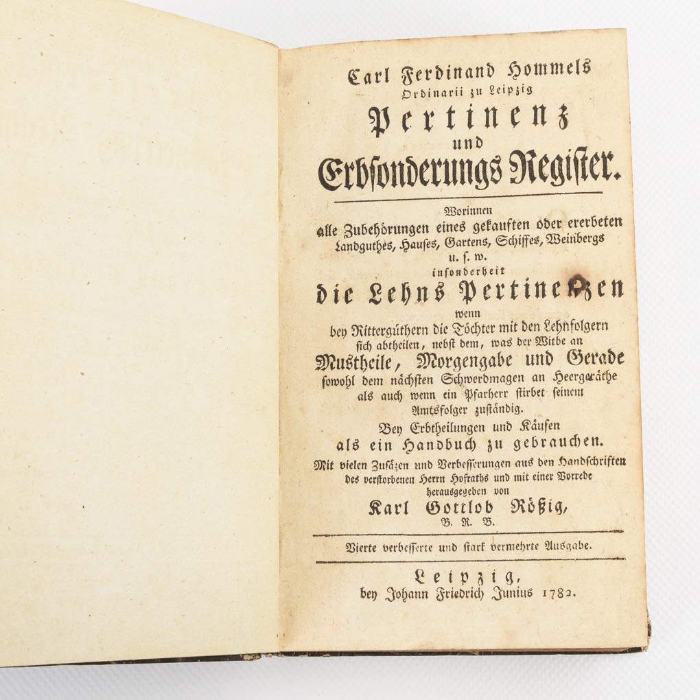 "Worinnen alle Zubehörungen eines gekauften oder ererbten Landguthes, ...die Lehns Pertinenzen, ... Bey Erbtheilungen und Käufen als Handbuch zu gebrauchen.".