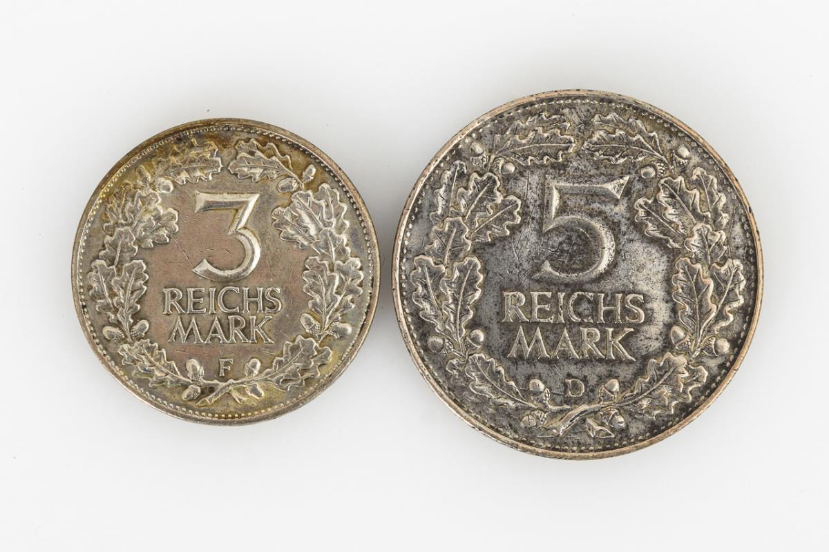 5 Reichsmark, Münzort D. / 3 Reichsmark, Münzort F. Zustand: sehr schön+ bis vorzüglich.