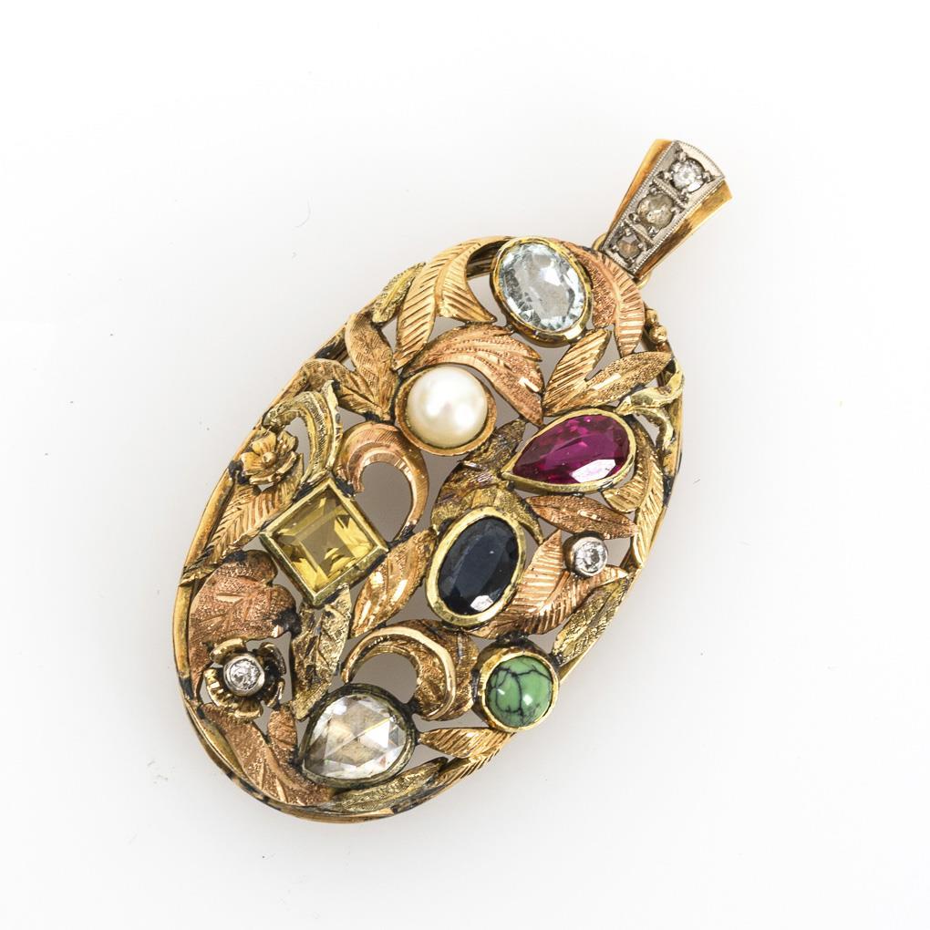 Aufwendig gearbeiteter Anhänger, bunt besetzt mit Zuchtperle, Citrin, synthetischem Rubin, Türkis, Aquamarin, Saphir, Altschliff-Diamant und 5 kleinen Diamantrosen. Passend zu Brosche Kat.-Nr. 322 und Ring Kat.-Nr. 321.