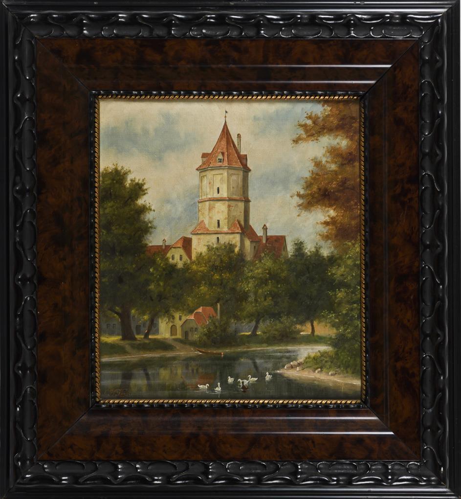 Idyllische Szenerie mit Tierstaffage auf dem Wasser vor dem Turm im Sonnenschein.