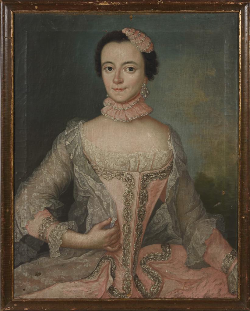 Porträt der Gräfin Reuß-Schleiz zu Köstritz im rosafarbenen Kleid. Kleine Defekte, Altersspuren.