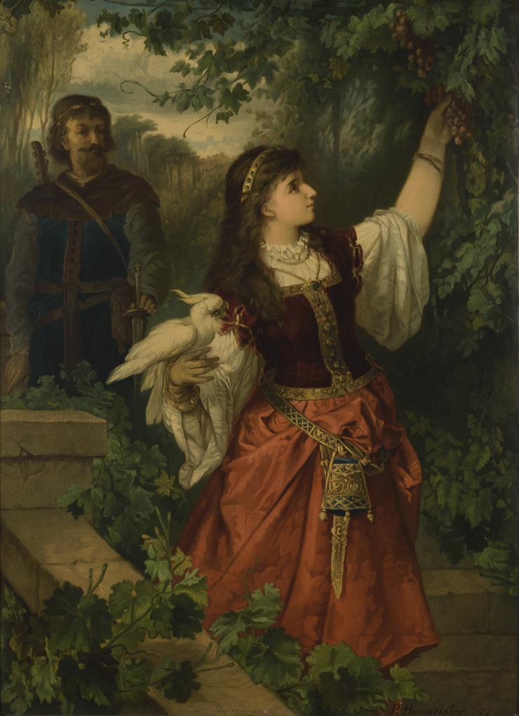Reich mit Akanthusfriesen und Rocaillen-Eckbesatz reliefierter Rahmen. Auf Leinwand kaschierte Farblithografie "Im Weingelände" nach G. Burmester. Wenige Alters-/Gebrauchsspuren.
