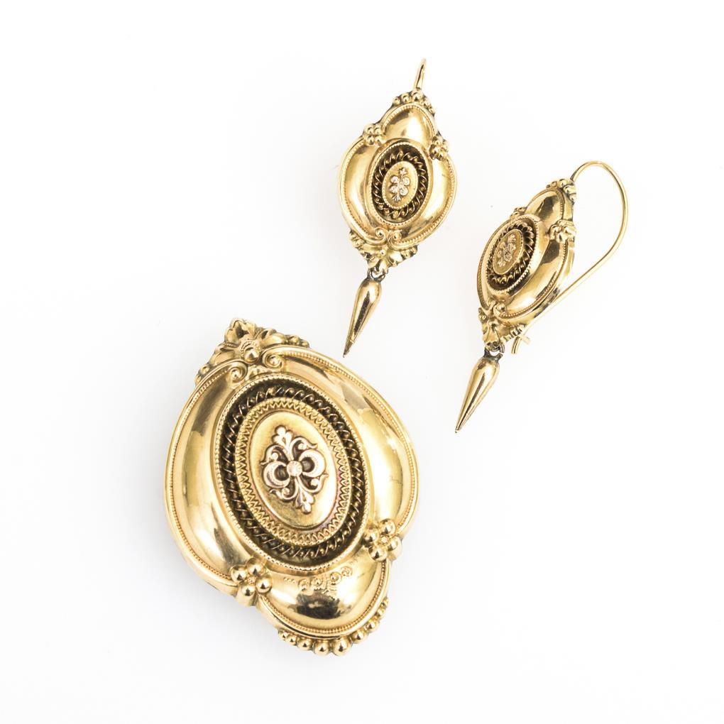 In Hohlform reliefierte, verzierte Brosche. Rückseitig verglast gerahmtes Medaillonfach, kleine Öse, Abhängehaken und Hakenverschluss. Dazu passendes Ohrhängerpaar mit großen Haken und Sicherungsbügeln.
