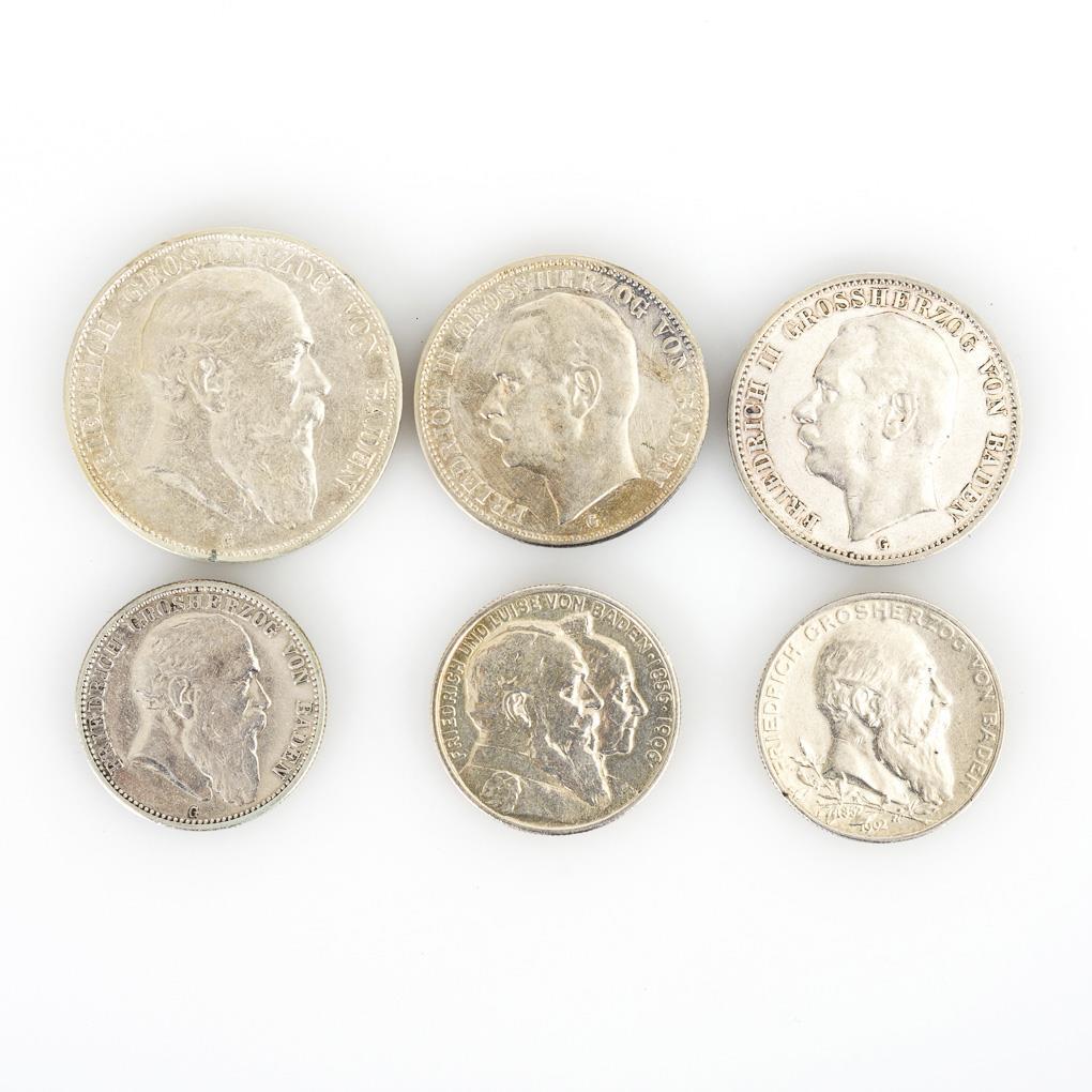 5 Mark, "Friedrich Grosherzog (sic) von Baden", 1907. / 2x 2 Mark, dito, 1902 und 1903. / 2x 3 Mark "Friedrich II. Grossherzog von Baden". 1909 und 1910. / 2 Mark, "Friedrich und Luise von Baden 1856 - 1906", 1906. Zustand: sehr schön.