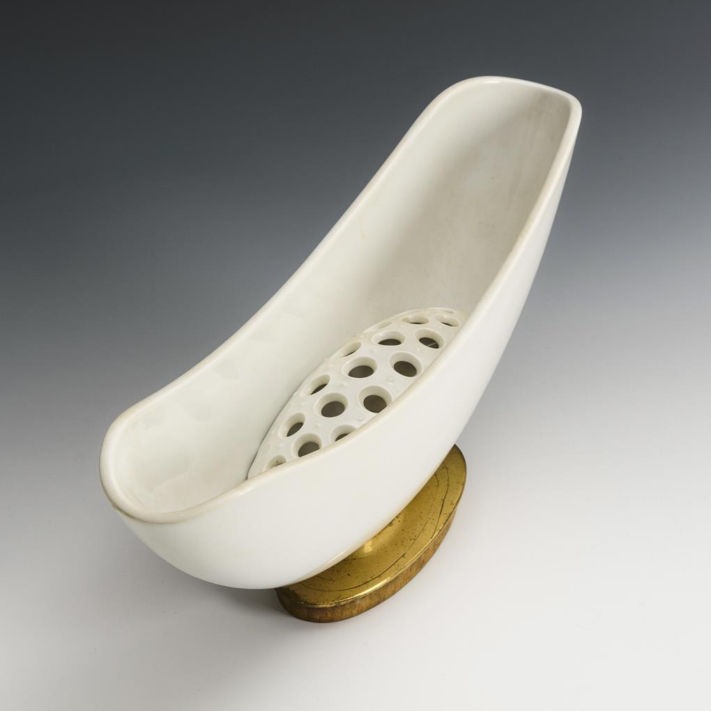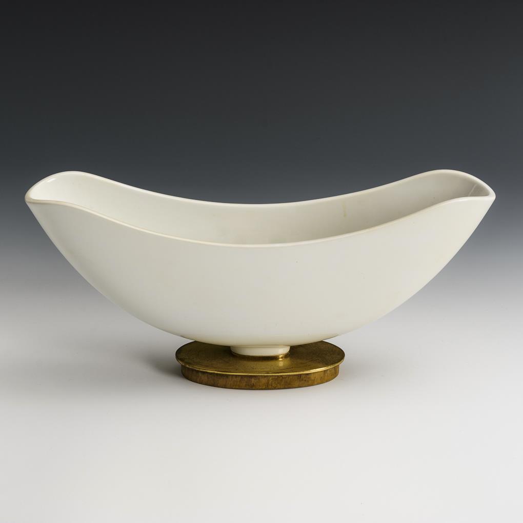 Weiß, Holzfuß mit Messing. H 15 cm, L 33 cm.