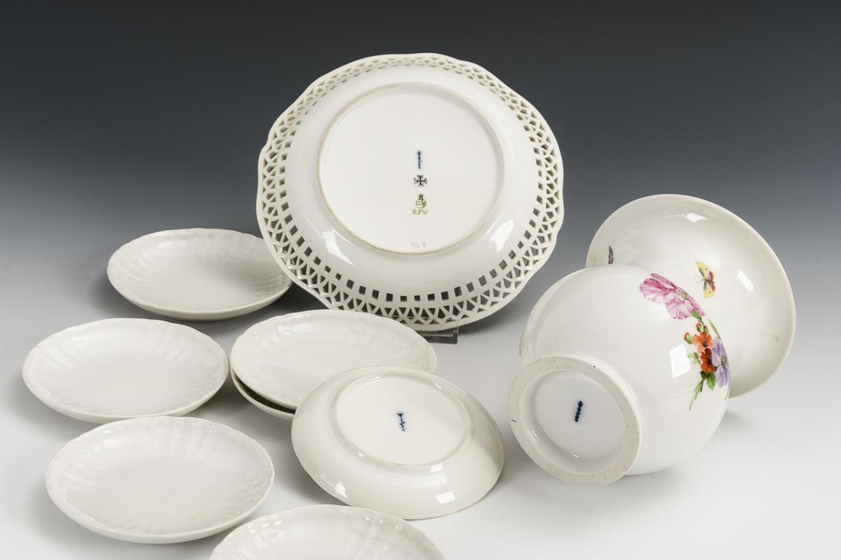 Vase, 8 Teller und Durchbruchschale. KPM Berlin.