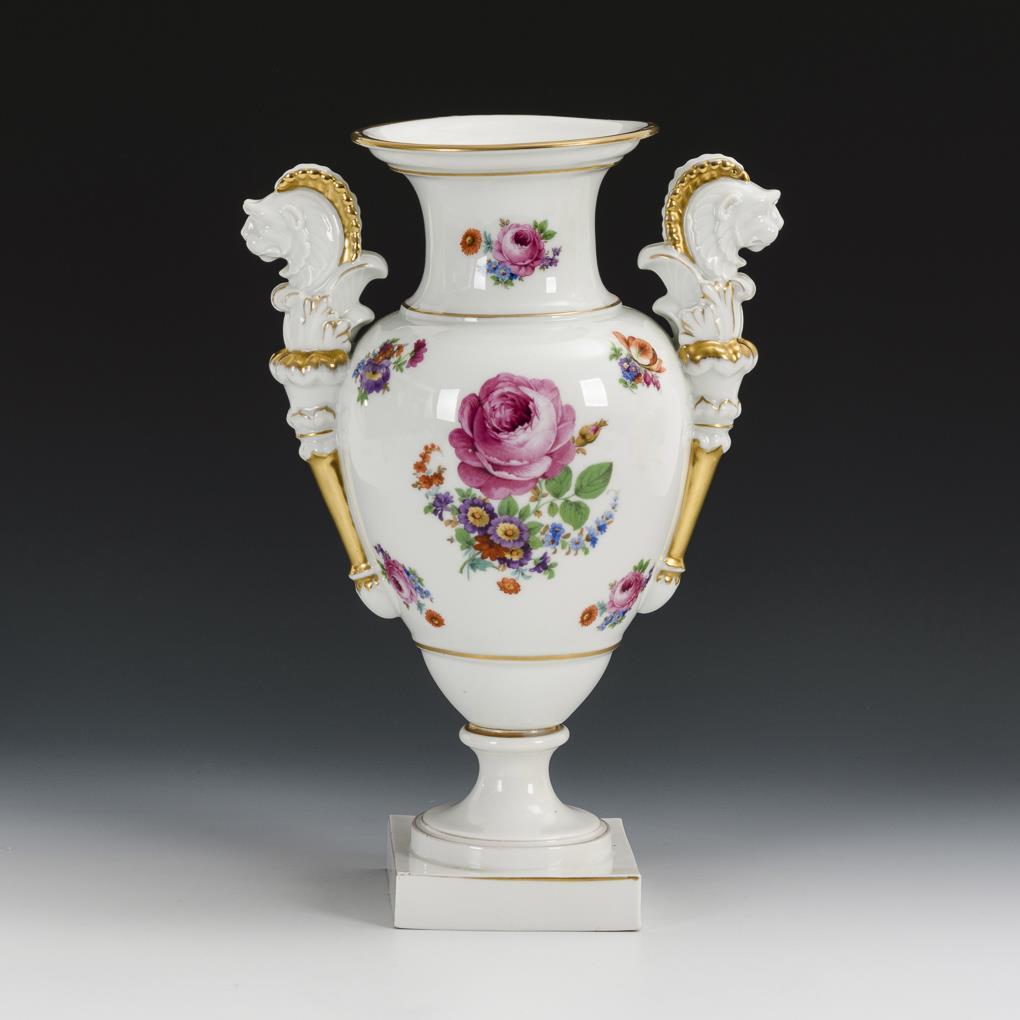 Löwenkopfvase mit Blumendekor. Aelteste Volkstedter.
