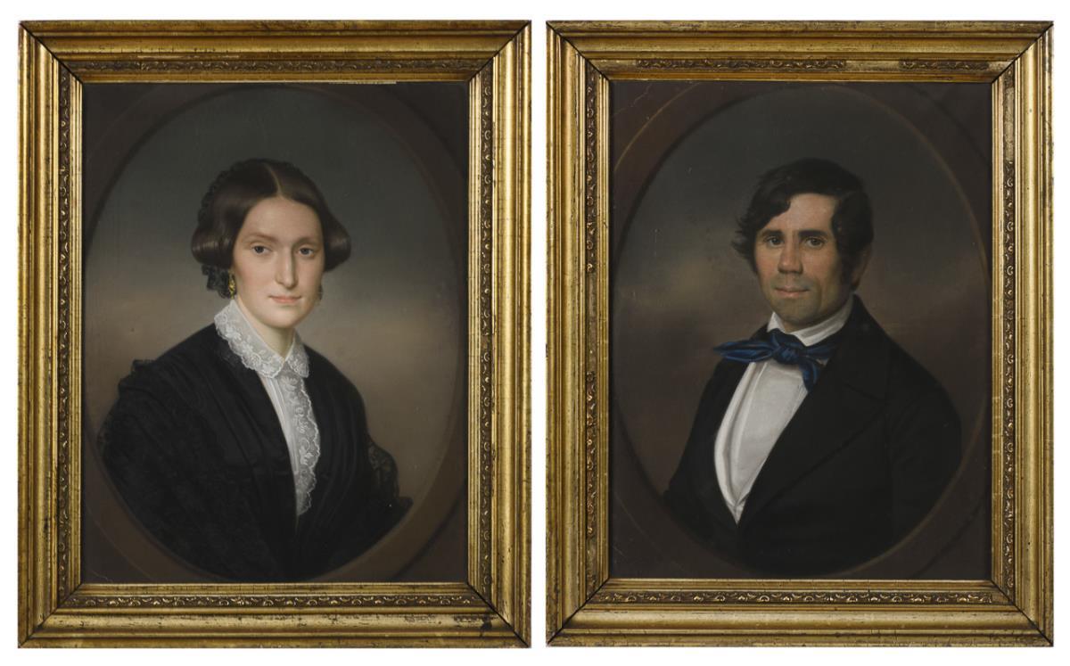 Qualitätvolle Porträts des Paares in schwarz-weißer Kleidung mit fein gemalter Spitze und Goldschmuck vor angedeutetem Wolkenhimmel. Je leichte Altersspuren.