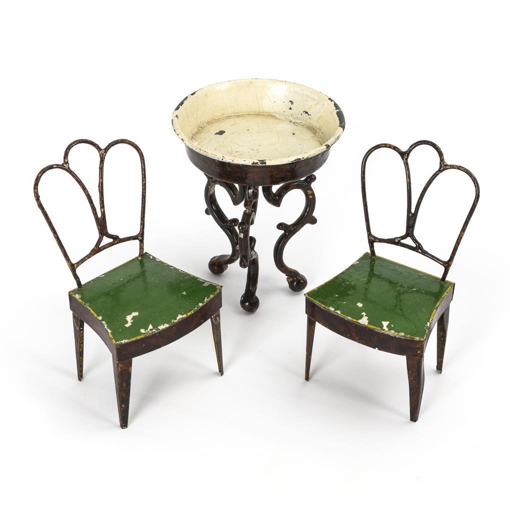 Laube mit 2 Stühlen und rundem Blumentisch mit 3 geschweiften Beinen. Altersspuren, nachlackiert, Lötstellen.