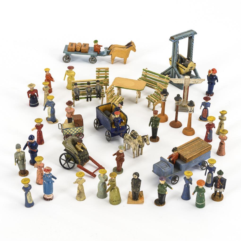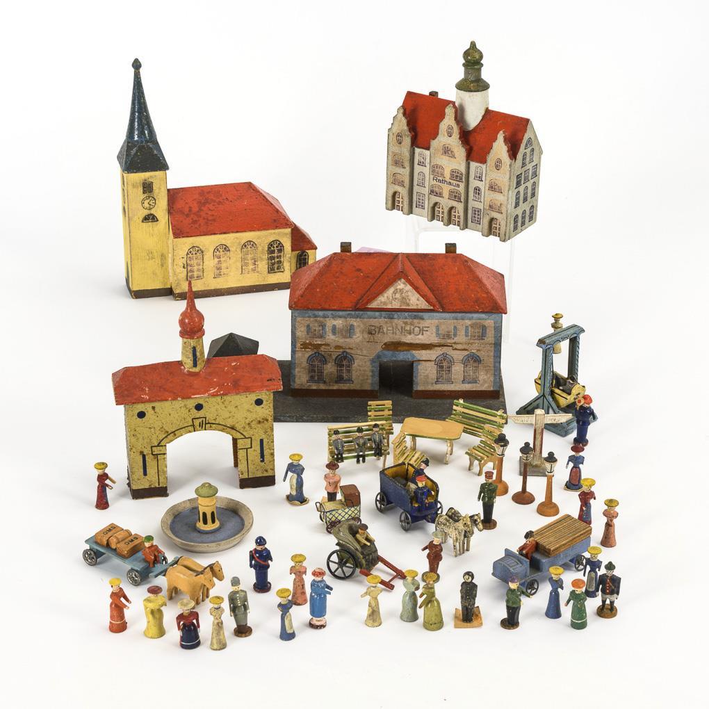 Kirche, Rathaus, Bahnhof, Stadttor, Brunnen, verschiedene Fuhrwerke und Figuren. Altersspuren, kleine Defekte.